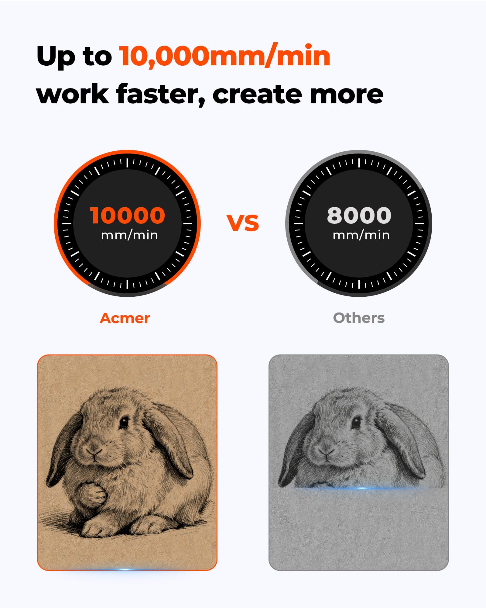 - High-Precision Laser Engraving and Cutting: Acmer S1 laser engraver machine with 2500mW diode laser power, 24W machine output, 455±5nm wavelength, and 2mm focal length for ultra-fine accuracy. Achieve up to 10,000mm/min engraving speed and 0.01mm repeatable positioning accuracy—perfect for detailed, vivid engraving and cutting on various materials.