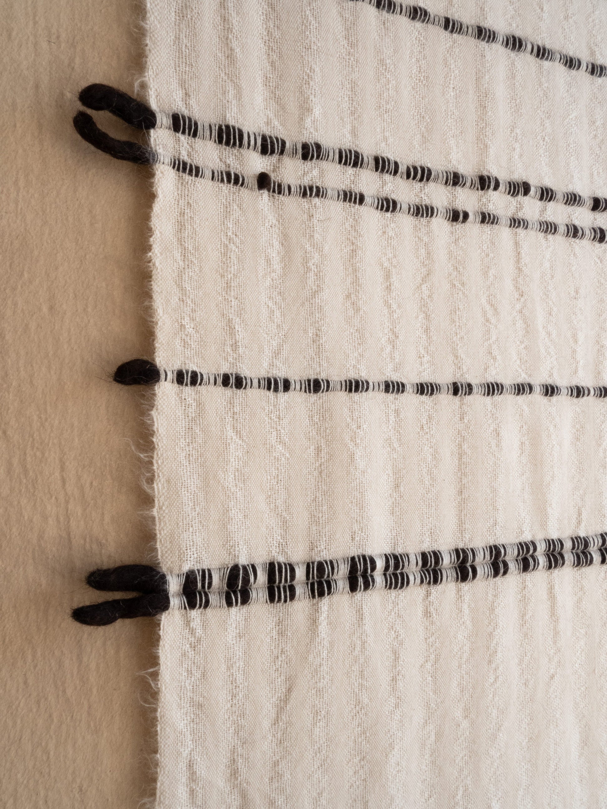 Expertly crafted from hand-spun mohair and cotton using ancient weaving techniques, its intricate composition showcases rich tonal variations and a sculptural feel. The piece is finished with brass mounting bars, adding a sophisticated, modern touch to its organic textures. Designed for effortless installation, it can be hung with just two simple nails, making it an elegant statement for contemporary, minimalist, or artfully curated interiors.