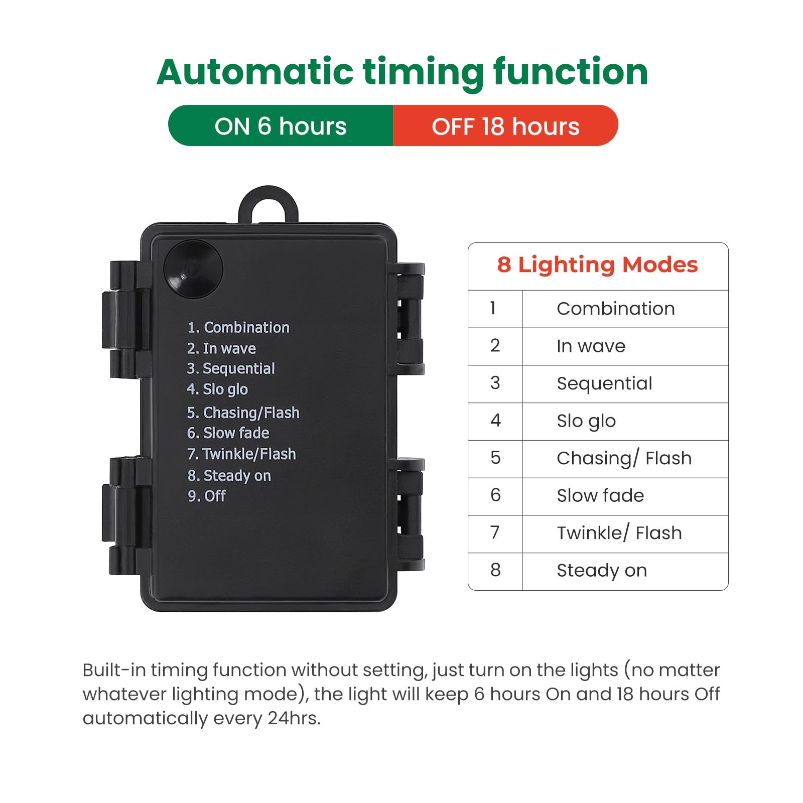 • Battery-operated timer: 6 hours on, 18 hours off for effortless daily lighting