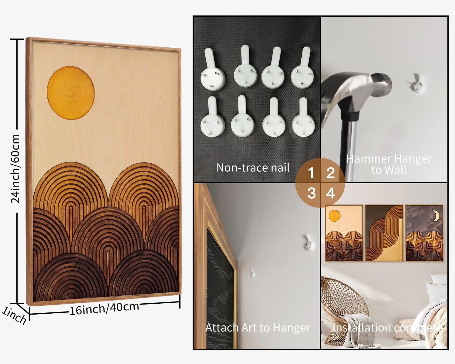 Set, Mid Century Modern Geometric Line Wall Decor, Bohemian Sun and Moon Art Paintings, Beige Brown Wooden Artwork for Living Room Bedroom Office 16"x24"x3